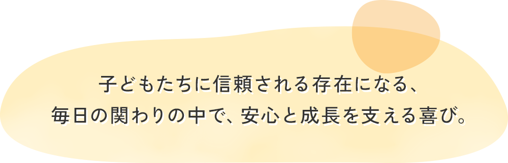 子ども達との関わりでは楽しいこともあれば、辛いこともあります。どんな時でもお互いの意見を伝えあってコミュニケーションをすることで私だけにしか言えないんだ、相談できないんだと頼りにしてくれた時が、信頼関係を築くことができたと感じられて この子に長く寄り添いたいと思えるのです。